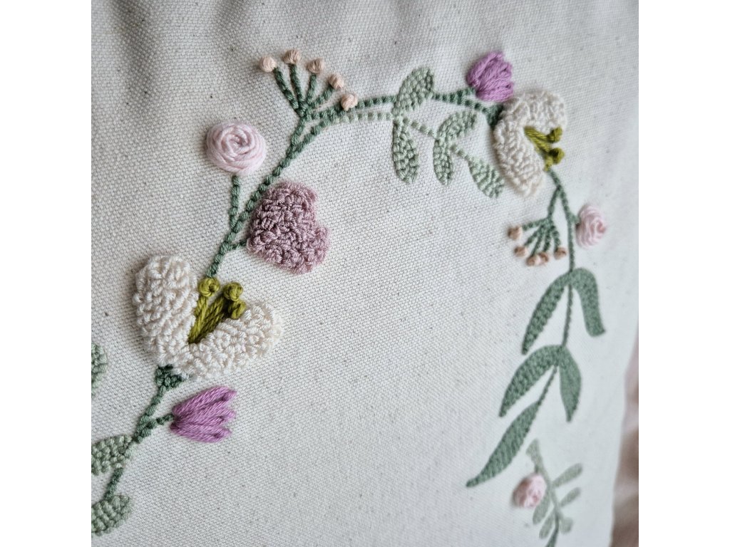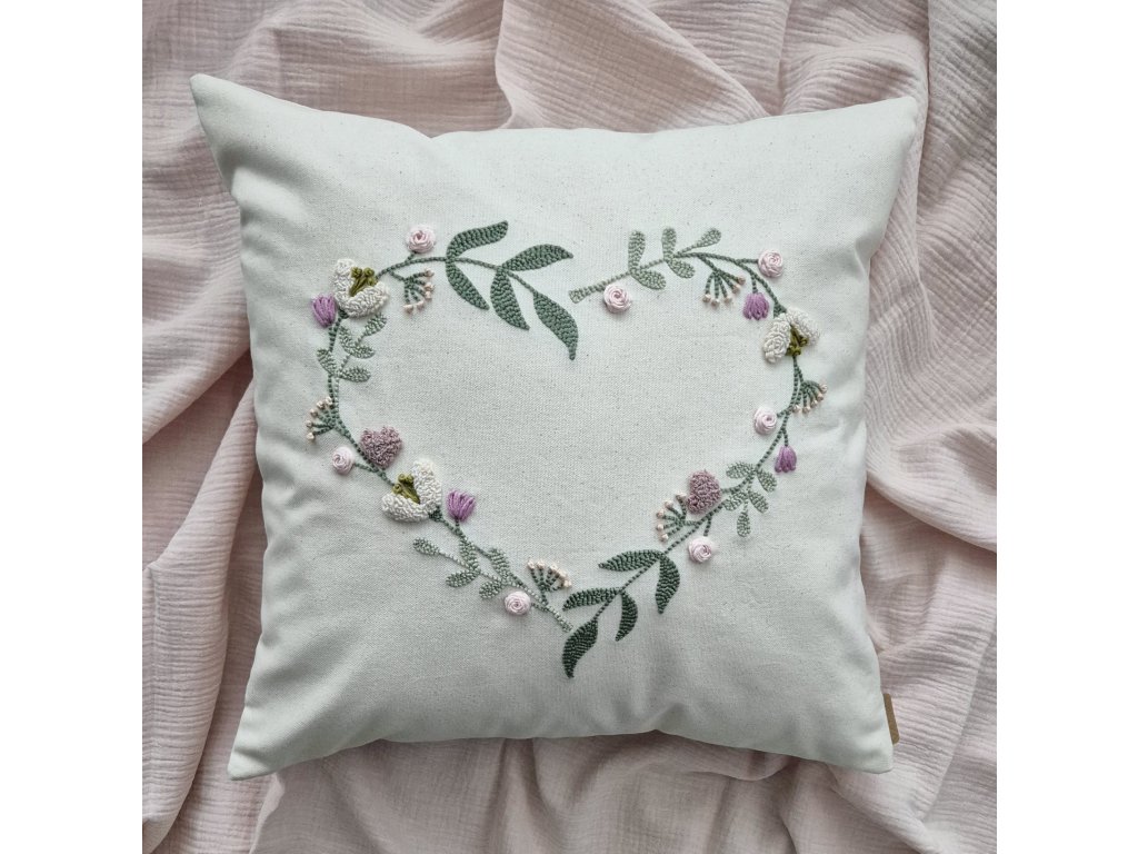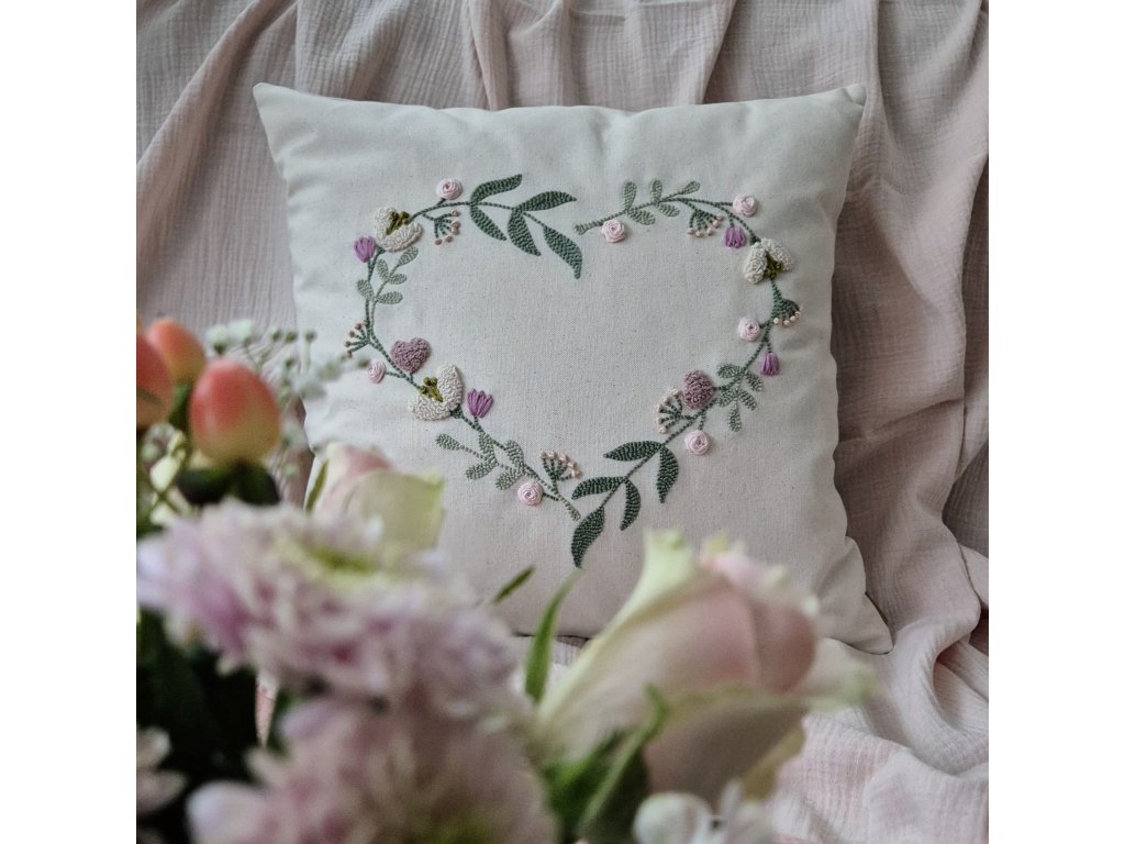Jemná ruční výšivka květinového věnečku ve tvaru srdce v růžových a zelených odstínech vnese do interiéru klid, harmonii a špetku něhy. Srdce symbolizuje lásku, blízkost a domov a díky tomu je polštářek krásným detailem nejen na Valentýna, ale i jako celoroční dekorace.